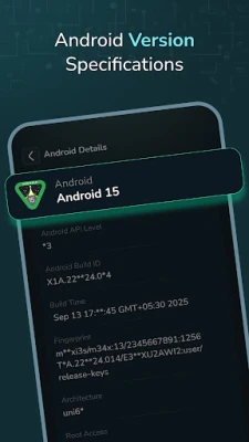 Dengan antaramuka yang intuitif, aplikasi ini membentangkan ringkasan pantas tentang status peranti anda terus dari skrin utama, termasuk versi Android, nama peranti, paras bateri, RAM, dan storan dalaman. Untuk butiran yang lebih mendalam, anda boleh meneroka bahagian khusus yang memaparkan maklumat terperinci tentang model peranti, sistem operasi, butiran pemproses, status sensor (aktif/tidak aktif), spesifikasi kamera depan dan belakang, penggunaan storan, kesihatan bateri, dan banyak lagi. Anda juga boleh meninjau aplikasi yang dipasang, maklumat rangkaian, dan ciri-ciri peranti yang disokong.