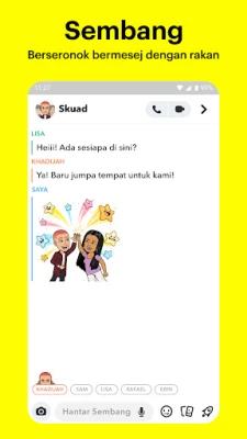 Sedia untuk merakam, meluahkan dan berhubung dengan cara yang paling ekspresif? Snapchat mengubah kamera anda menjadi pusat kreativiti utama, membolehkan anda merakam detik spontan sama ada melalui foto pantas atau video berpanjangan dengan hanya satu sentuhan. Serlahkan keperibadian anda dengan pelbagai Lensa, Penapis, dan Bitmoji yang sentiasa dikemas kini – malah ada ciptaan harian baharu daripada komuniti global yang bersemangat. Berhubung serta-merta dengan rakan-rakan melalui pemesejan langsung, atau kongsikan hari anda dengan Cerita Kumpulan. Anda juga boleh memulakan sembang video bersama sehingga 16 rakan, lengkap dengan Lensa dan Penapis masa nyata untuk pengalaman yang lebih meriah dan Friendmoji yang direka khas untuk anda dan sahabat.